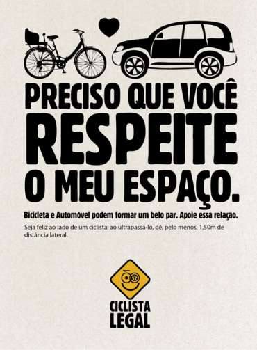 Para mostrar que a relação entre ciclistas e motoristas no trânsito pode e deve ser mais pacífica, a agência Getz Comunicação lança uma campanha que deve estar nas ruas em breve: Ciclista Legal.A campanha é uma iniciativa voluntária da agência, que realizou outras campanhas voluntárias, como “Essa vaga não é sua nem por um minuto”, sobre a conscientização do uso das vagas de estacionamento destinadas a idosos e deficientes físicos e a campanha “190 Km/h é crime”, relativa ao acidente de carro que matou dois jovens em Curitiba.