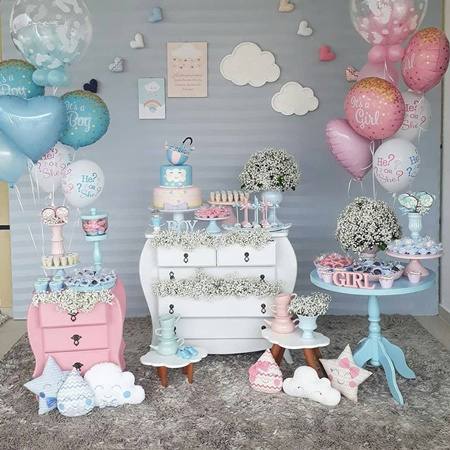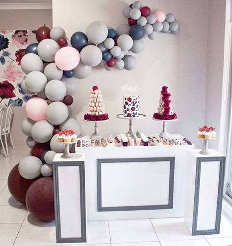 Outra aposta para garantir uma festa moderna e bonita são os arcos de balão desconstruídos. Isso significa que aquela disposição tradicional de balões acima da mesa de bolos sai de cena para dar espaço à novas maneiras de posicionar os balões em torno da mesa principal. Invista em arcos que iniciem da metade da mesa desçam até o chão em frente a ela, com balões em tons complementares mais escuros e claros, conforme a paleta de cores da festa.