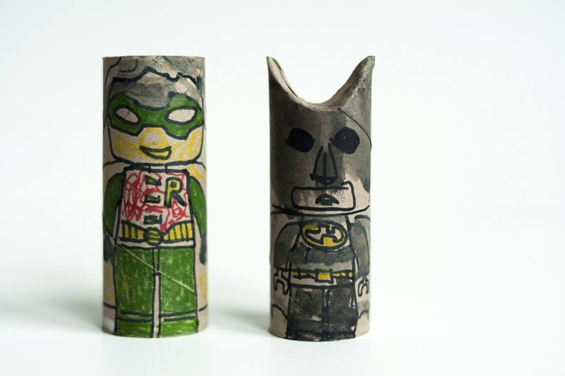 Por aqui existe um jogo para Playstation II que vem fazendo um sucesso enorme. É uma versão lego de Batman. Que tal levar os personagens do jogo pra casa recriando os heróis com rolo de papel higiênico? Seu pequeno vai adorar criar e brincar.