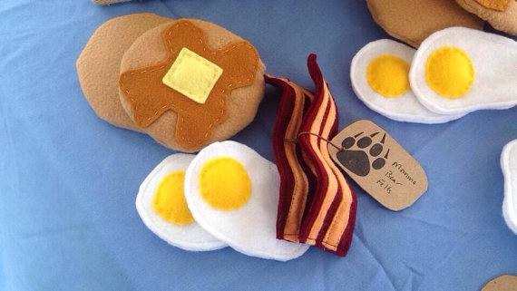 Para aqueles prendados um brinquedo novo e divertido para as crianças, acreditamos que reproduzir em feltro o bacon, o ovo, a panqueca, o morango não seja a atividade mais difícil, mas para os não tão prendados tem aqui e aqui.