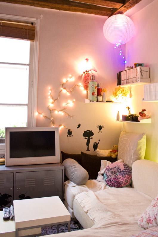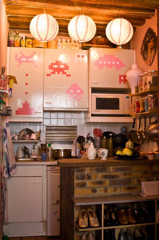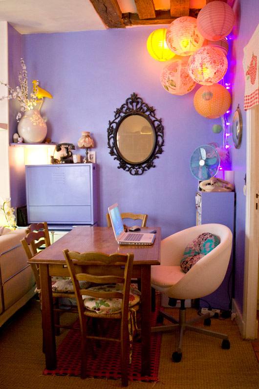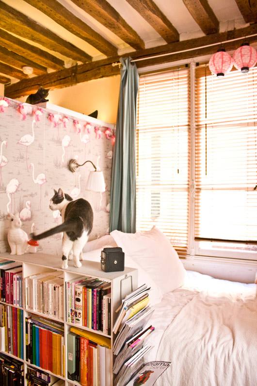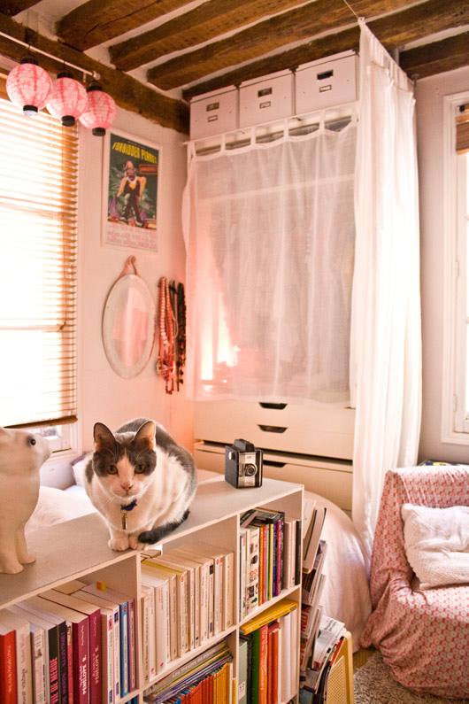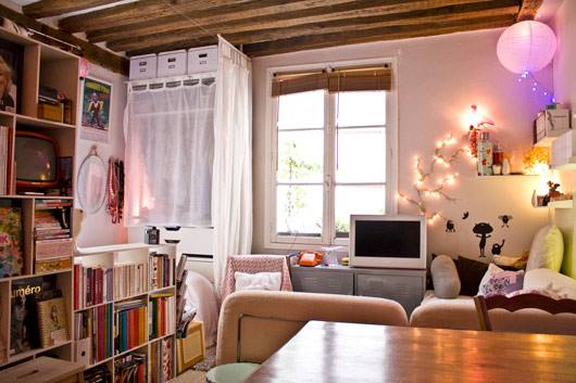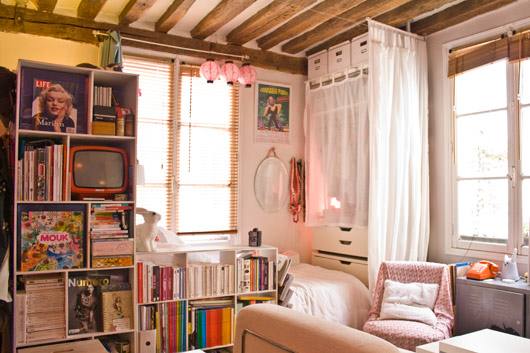 O apartamento está em Paris e é simplesmente minusculo, ainda assim tem sala de jantar e biblioteca. Tudo fica bem amontoado, mas que na minha opinião só deu um charme a mais pro local. Pra quem tem pouco espaço é uma ideia.