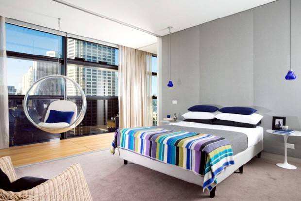 O cinza, já foi dito, é uma cor que cai muito bem quando o intuito é criar uma decoração mais contemporânea. Quando dialoga com um cenário urbano de forma tão aberta como neste quarto na Austrália, então, chega a ser covardia. Tapete, parede e colcha – sem esquecer a megajanela – formam a base perfeita para que brilhem os azuis que dão o toque masculino no ambiente. Ícones do mobiliário moderno, como a mesinha lateral de Eero Saarinen e a cadeira Bubble, de Eero Aarnio, fazem deste um quarto único.