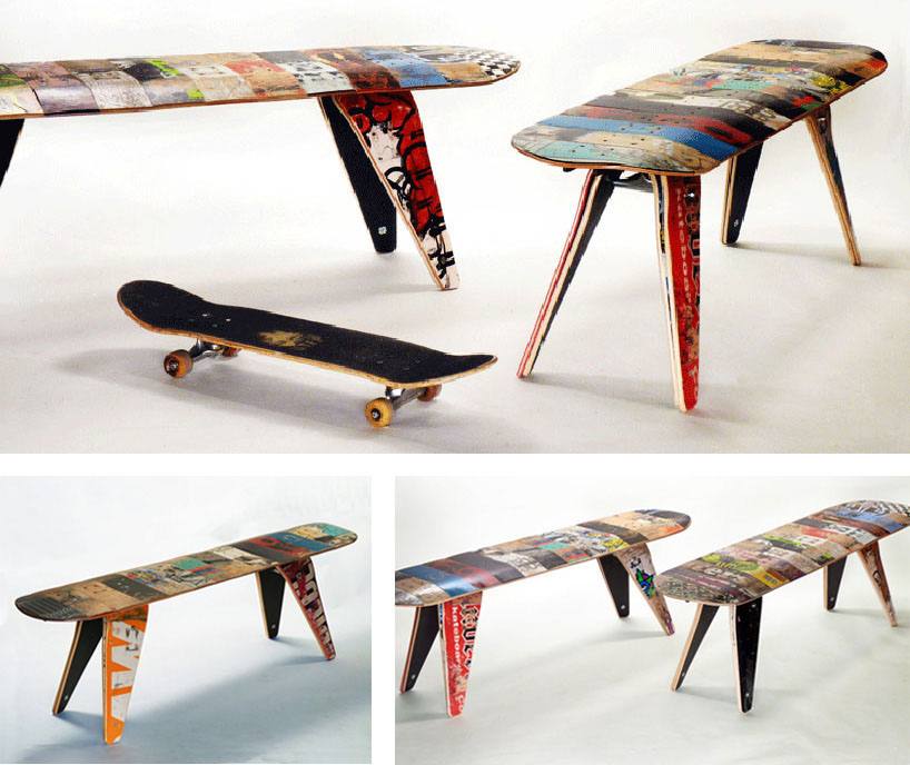 A empresa americana Deckstool encontrou uma forma diferente de incentivar o esporte: desenvolveu um tipo de mobiliário feito inteiramente a partir da recuperação de skates quebrados. Constituídos das tábuas dos skates, os assentos são 100% reciclados e podem ser montados tanto na forma de banco – que, aliás, lembra um picolé – quanto no formato de banquetas para bar.