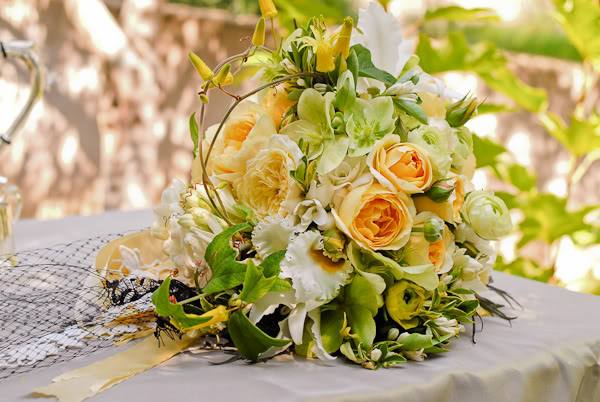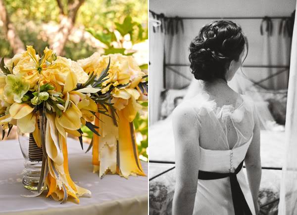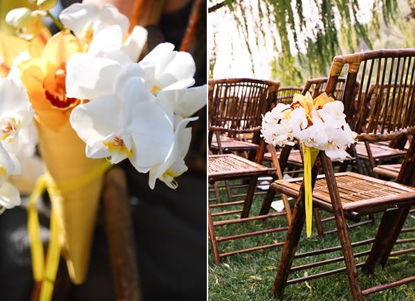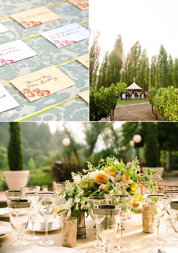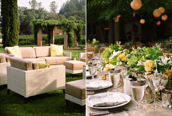 Os detalhes da decoração de um casamento ao ar livre. Amarelo, verde e branco na paleta de cores.