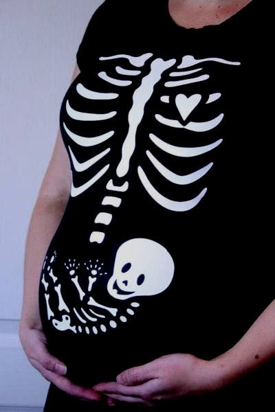 A ideia de moda hoje não é tanto para os pequenos e sim para as futuras mamães. Pra curtir o Halloween, mamãe e bebê esqueleto ![]()