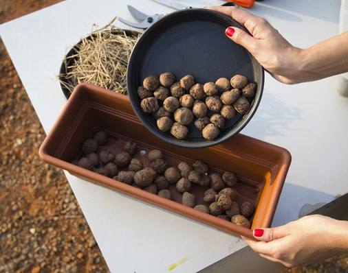 Forre a jardineira com uma camada de aproximadamente um dedo de argila expandida. Esse material serve para reter a umidade e ajuda na drenagem do vaso.