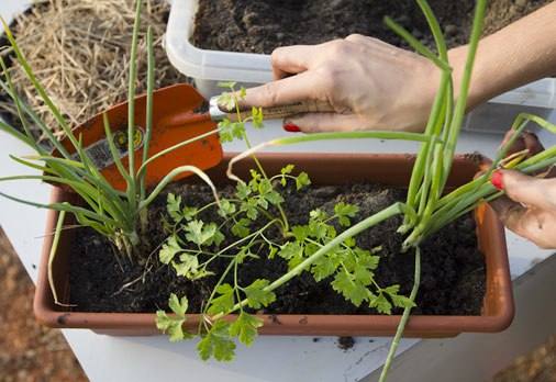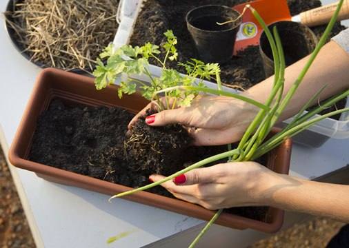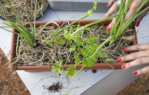 Para plantar temperos, como usamos aqui, podem ser usadas jardineiras com a partir de 10 cm de altura. Se você deseja plantar hortaliças, escolha jardineiras mais altas, com 20 a 30 cm de altura.