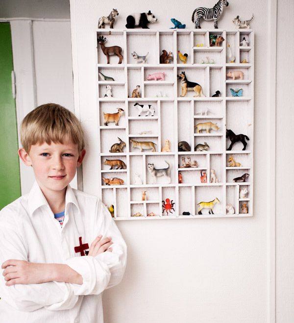 Uma caixa daquelas onde vem as bolas da arvore de natal, copos, ou pequenas caixinhas coladas umas as outras formam uma prateleira para exibir pequenos (e normalmente MUITO pequenos) tesouros.