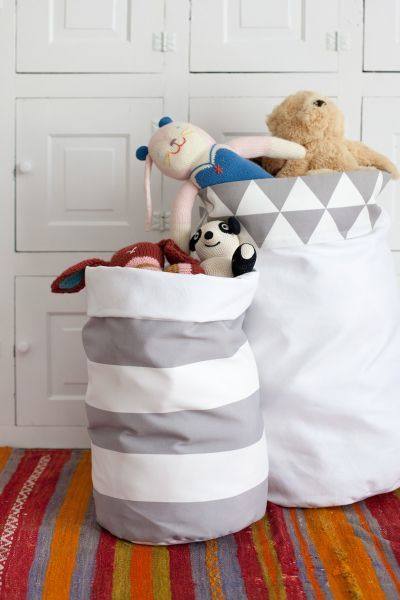 Sacolas de tecido reforçado, facilitam a brincadeira, a arrumação e dão a criança senso de organização.