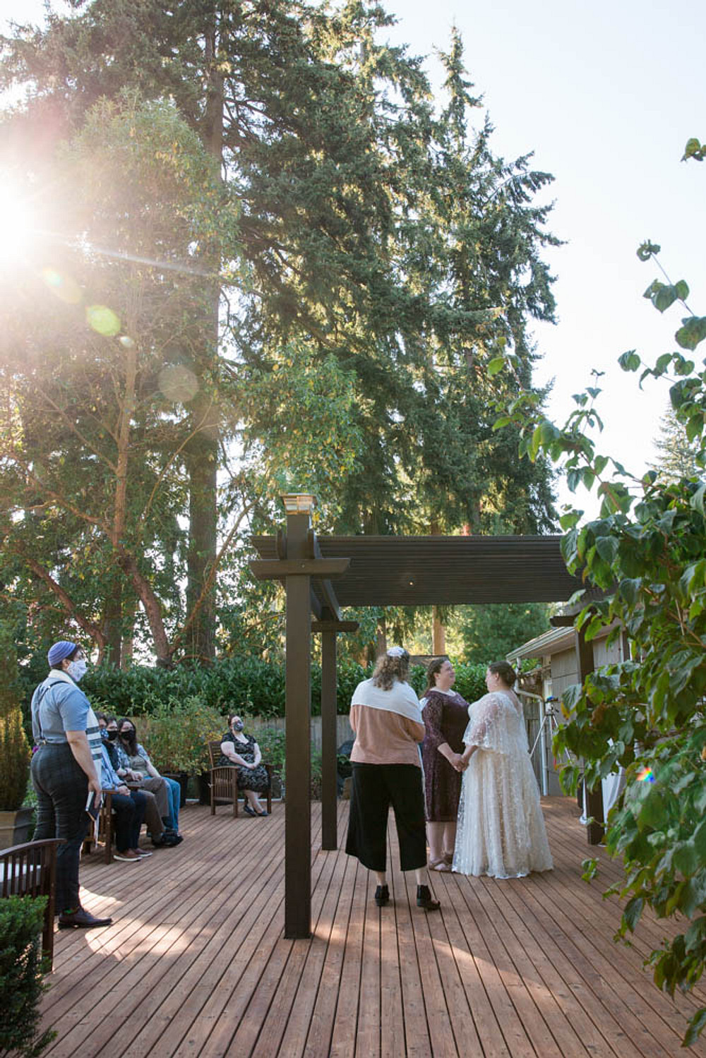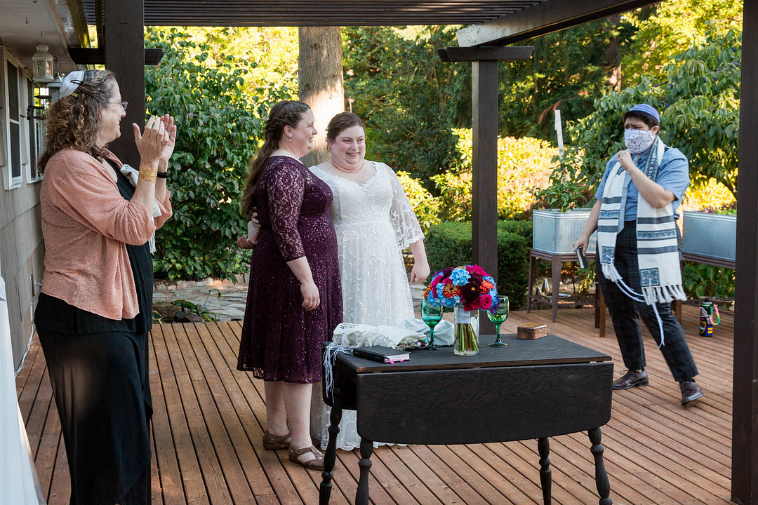 A cerimônia foi realizada em seu lindo quintal. Parecia um paraíso do noroeste do Pacífico! Havia hera arrastando as cercas, vegetação infinita e árvores grandes e altas. Seattle vivendo no seu melhor. Uma bandeira soprava sutilmente ao vento para que todos vissem que estava acontecendo um casamento, usando mastros de bandeira específicos para a altura do quintal , para que tanto os convidados quanto os transeuntes pudessem desfrutar. O que parecia ser um cenário de hotel, na verdade era o deck delas. Uma pérgula foi construída nele, do tamanho perfeito para ser usado como chupá (tenda sob a qual se realiza o casamento judaico).