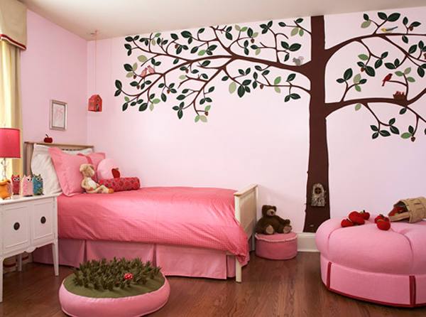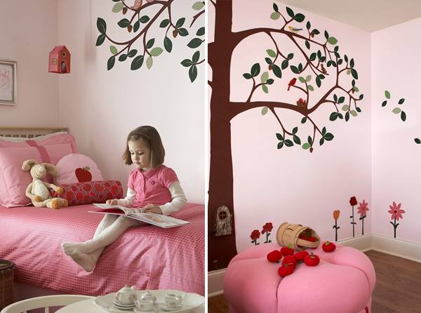 Um quarto todo rosa, mas com elementos inusitados para um quarto “de menina”. Apesar de pequeno, os detalhes deram o tom lúdico que todo quarto infantil merece. Tem casinha de passarinho, maçãs em feltro, corujinhas estampadas e uma árvore linda adesivada na parede. E o tema floresta mágica, pode ser facilmente adaptado para um menino. É só trocar os detalhes rosas por tons verde e marrom.