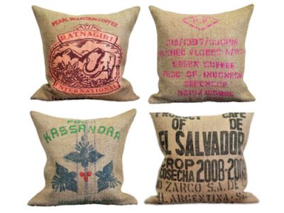 Travesseiro feito a partir de sacos de grão reciclados, encontrados em mercados da Guatemala. Eles ainda são tingidos organicamente por uma cooperativa de mulheres, usando flores, plantas, cascas de árvores e resíduos vegetais. Ecologia e responsabilidade social juntos, além de...