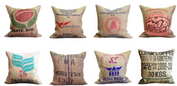 Travesseiro feito a partir de sacos de grão reciclados, encontrados em mercados da Guatemala. Eles ainda são tingidos organicamente por uma cooperativa de mulheres, usando flores, plantas, cascas de árvores e resíduos vegetais. Ecologia e responsabilidade social juntos, além de ser uma graça.