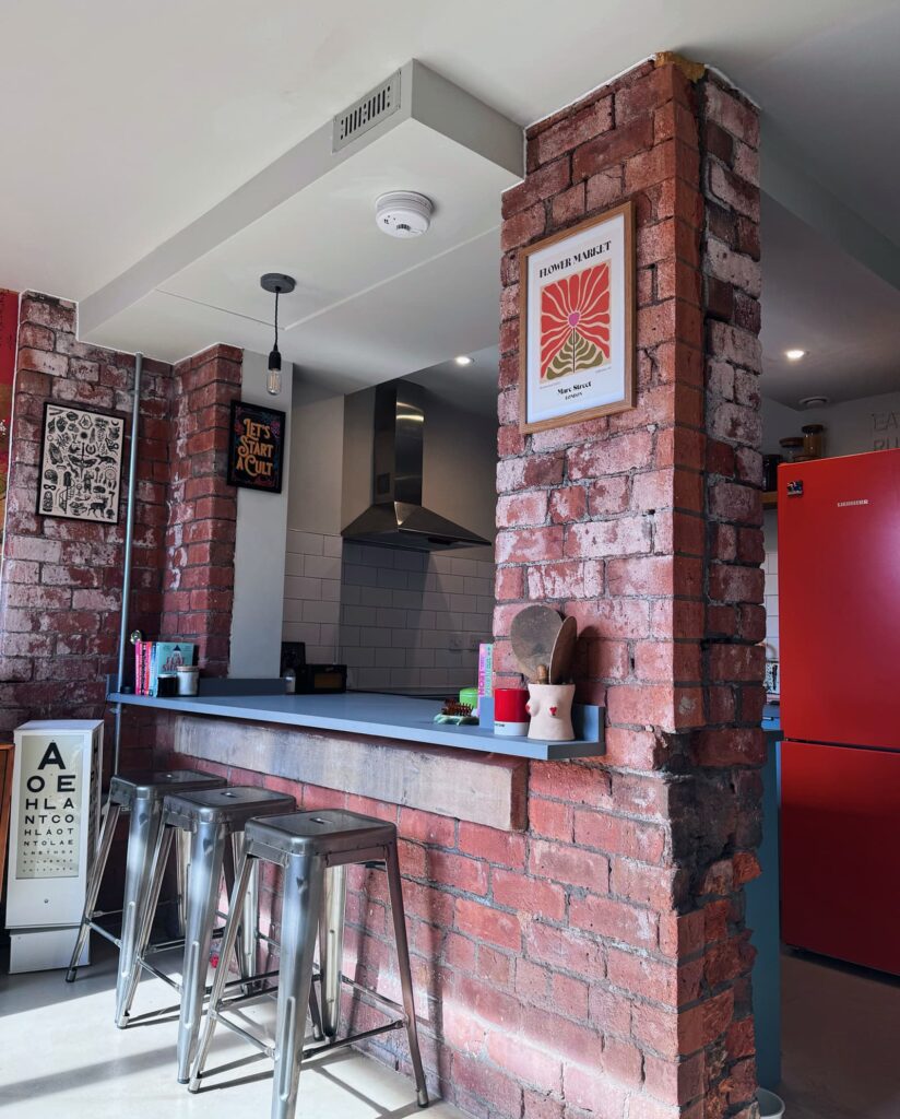 Laura não mede palavras ao descrever seu espaço: um loft acolhedor, vibrante e absolutamente personalizado. Com uma parede de tijolos expostos, móveis de segunda mão e muitas cores, a decoração reflete sua personalidade expansiva. “Sou uma pessoa colorida que se entrega à vida, e sinto que isso está completamente refletido no meu lar.”