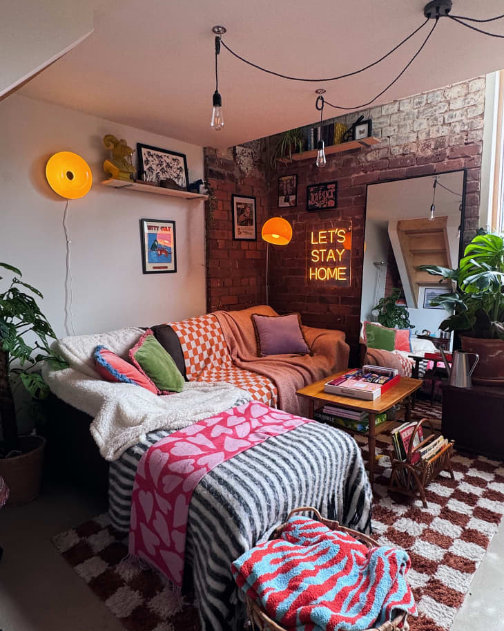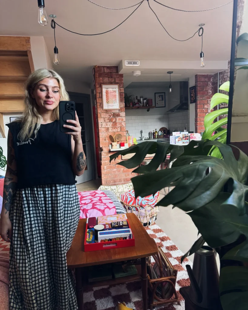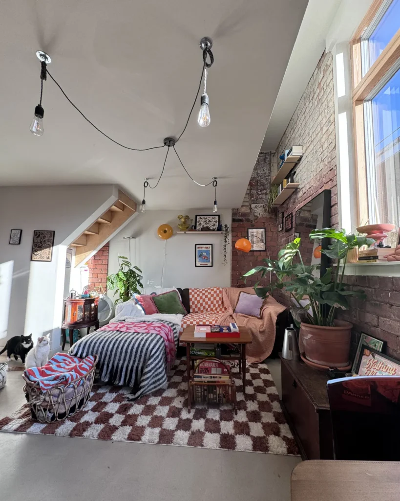 A escolha de cada elemento decorativo foi feita com cuidado e amor. Laura optou por um sofá de canto estrategicamente posicionado no meio da sala para ajudar a dividir o espaço, já que o loft não possui divisórias tradicionais. Tapetes e mantas trazem textura e conforto ao ambiente, com peças de lojas como TKMaxx, HomeSense, Dunelm e Primark. O espelho é da IKEA, e o tapete xadrez veio da George at Asda.
